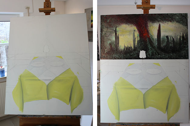 Während des Entstehungsprozesses eines Bildes einen Arbeitsschritt fest zu halten, hat etwas Magisches. Irgendwie wird die Zeit angehalten. Dieses Erscheinungsbild verschwindet im nächsten Schritt für immer. Ist Teil des Bildes, bleibt Teil des Bildes, verdeckt für immer.